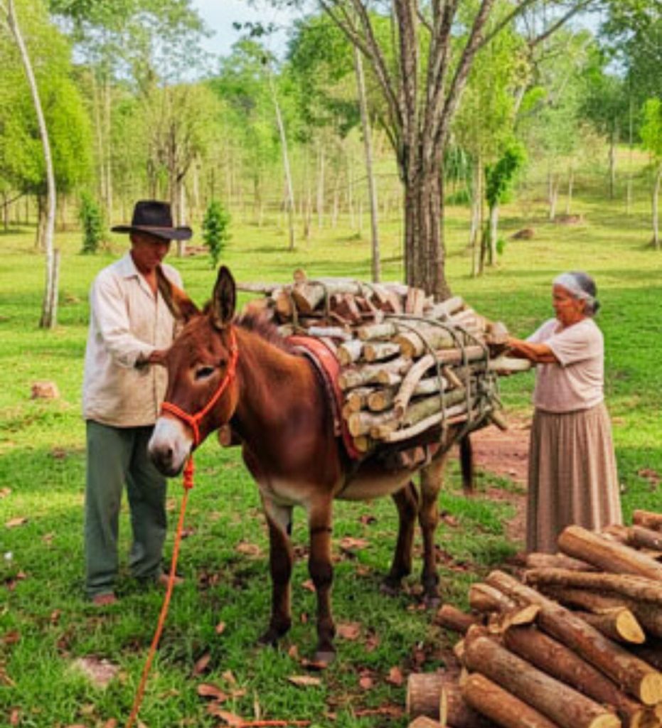 Una vez reunida la leña, la llevaba a un claro de sabana donde había amarrado al burro. Allí extendía la jamuga sobre el lomo del animal y comenzaba a acomodar la carga con habilidad, balanceando los trozos para que ningún lado quedara más pesado que el otro. Luego ajustaba las sogas, revisaba que nada fuera a caerse y comenzaba la arriada hacia la casa.